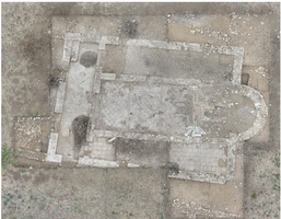 Pour la première fois, des travaux ont également été engagés de manière à assurer la publication de la grande basilique à cinq nefs fouillée en 1993 par le service archéologique grec (fig. 5). L’histoire du bâtiment est manifestement longue et compliquée. Dans son état final, la basilique mesure 30 m de long environ sur 22 m de large. Elle fut construite à l’époque impériale et servit probablement de basilique civile, associé à un complexe de bains dont sont connues deux pièces. Elle fut ensuite transformée en une église, probablement à trois nefs, agrandie en une basilique à 5 nefs dans une phase encore ultérieure. Les travaux de 2024 se sont principalement concentrés sur des murs qui apparaissent en plusieurs endroits à l’extérieur de l’édifice. Plusieurs appartiennent à des constructions situées à l’Ouest du narthex, d'autres sont isolés au Sud et au Sud-Est de la basilique. On observe que des travaux d’aménagement importants ont été menés lors de la construction de la basilique. La colline et probablement les niveaux d’occupation plus anciens ont été décaissés pour aplanir le sol et aménager une terrasse sur laquelle le monument fut bâti. Le terrain naturel fut partiellement enlevé à l’Ouest de la basilique. Son altitude était plus basse à l’Est, où il n’a pas été atteint par les fouilles. Les murs qui se trouvent au Sud de la basilique appartiennent à d'autres bâtiments, qui se développaient vers le Sud. Des fouilles supplémentaires sont nécessaires pour élucider la séquence architecturale et stratigraphique de la zone.