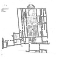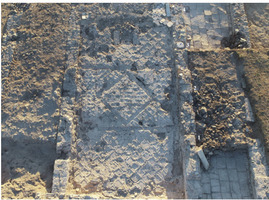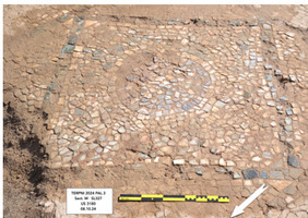 Dans la zone 3, la fouille s’est étendue sur une superficie de 180 m² environ, principalement dans la partie Ouest de l’édifice, ce qui a permis de dégager la totalité de la basilique à trois nefs (fig. 2). Le premier objectif de la campagne a donc été atteint : il s'agissait de confirmer le plan et les dimensions de l’édifice, tout en cherchant d’éventuels aménagements liturgiques. Un autre objectif était d’explorer les abords Nord et Ouest de l’église, afin de vérifier l’existence dans cette zone d’édifices attenants, suggérée par plusieurs anomalies visibles sur les relevés géophysiques de 2022, et de poursuivre le dégagement commencé en 2023 de la structure qui venait s’appuyer contre la façade Ouest de l’église. Le mur Nord de cette structure, probablement un portique, a été atteint et la présence d’une annexe, construite contre l’angle Nord-Ouest de la basilique est également très probable. Le narthex a été intégralement fouillé, ce qui a permis de repérer les 7 portes qui étaient percées dans ses murs. Toutes possédaient des seuils construits. Un banc se trouvait aussi dans l’angle Nord-Ouest de la pièce. Les travaux ont permis de préciser l’aspect de la colonnade qui séparait la nef centrale de la nef latérale Sud, pourvue de quatre colonnes dont plusieurs fragments ont été trouvés, ainsi que l’aspect de la barrière de chancel dont l’emplacement est matérialisé par deux épaisses bandes de mortier. Les quelques fragments en marbre conservés de la clôture suggère qu’elle comportait des plaques encastrées entre des piliers dans son registre inférieur, et dans son registre supérieur une rangée de colonnettes. Sauf dans la nef latérale Nord, où le sol ne paraît pas conservé, les sols de la basilique ont été atteints partout. Ceux de la nef centrale et du narthex était entièrement décorés de grands panneaux d’un opus sectile très mal conservé (fig. 3-4), tandis que celui de la nef Sud était recouvert d’un pavage de dalles en terre cuite. Dans la nef centrale et à l’Ouest du sanctuaire, le décor s’organisait de part et d’autre d’un grand panneau central décoré d’un losange inséré dans un carré, bordé à l’Est et à l’Ouest par deux grands panneaux de carrés blancs sur la pointe, entourés de rectangles en schiste noir et de petits carrés blancs aux encoignures. Les dalles de marbre provenaient parfois de matériaux remployés, dont les fragments de deux stèles inscrites. Le décor du narthex se présentait lui aussi sous la forme d’une composition symétrique, déterminée par la position de la porte ouvrant dans la nef centrale. Un panneau central, de même dimension que l’ouverture de la porte, était décoré de carrés blancs entourés de rectangles noirs en schiste et de petits carrés aux encoignures. De part et d’autre, deux panneaux rectangulaires formés d’un assemblage hétéroclite de pierres, étaient décorés d’un cercle inscrit dans un losange.