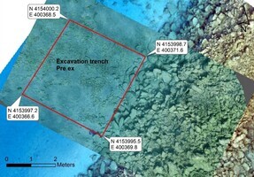 In 2023 when test-trenches were excavated in the seabed in direct connection to the harbour structure, and in 2024 the aim the aim has been to try to find cultural layers and/or artefacts that can be used to date the harbour structure. The excavation, which covered an area of 16m2, was concentrated to the seabed next to the north western extension of the platform, where the platform is the well-preserved and appears to have kept much of its original shape (Fig. 1). The area is also closer to the shore than the 2023 trench and the layers of loose sediments were estimated to be thinner (Fig. 2).