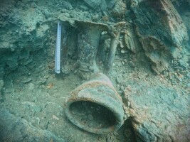 The survey showed that significant remains of the stone-built port facility are preserved on the seabed. These consist of fallen material, such as stones and worked building materials. Probably the most important findings are the amphora sherds found in the stone-built structure and the broken vessel in sector 4A (Fig. 3). The assemblages of these fragmentarily preserved vessels suggest that they were deposited during the use of the platform or at the time of its abandonment and collapse. They can therefore be used as clues in the discussion on the dating of the structure. In an area stretching from the trench up to the highest part of the structure the first layer of stones was removed in order to discern if there is any particular order or remains of original constructions within the pile of stones. An additional motif for excavating this profile was to distinguish if there was any pottery or other artefact that could reveal the date of construction.