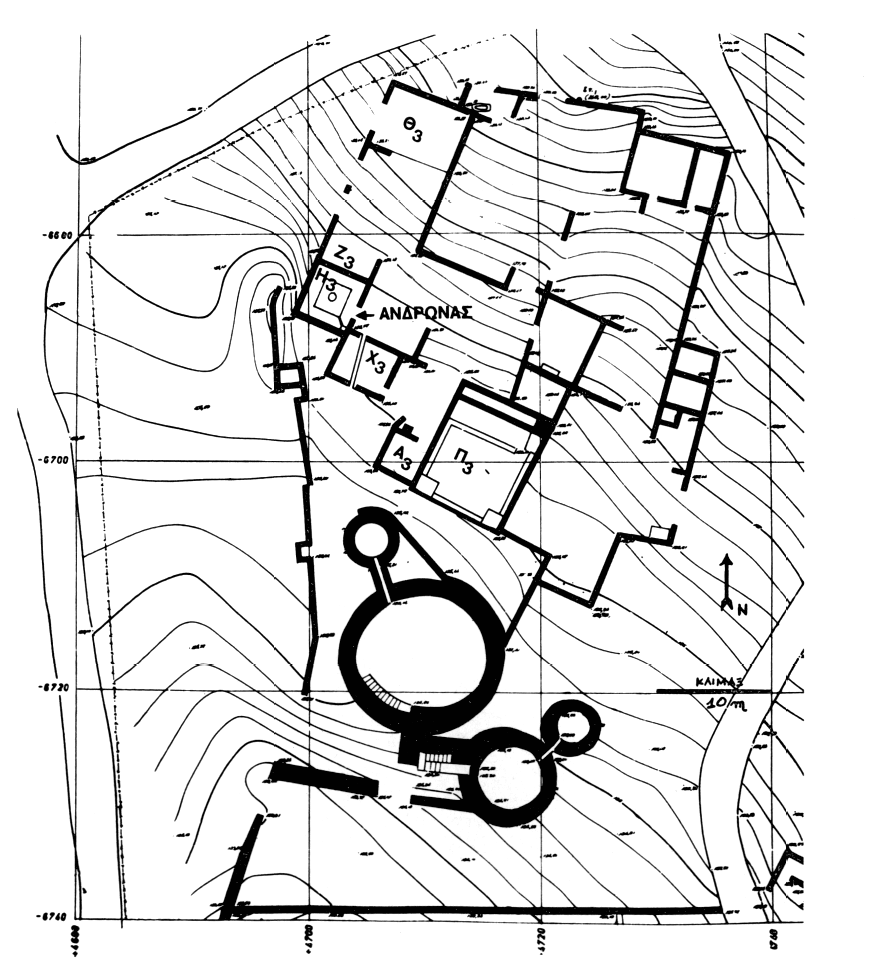 La pièce mesure 4,30 x 4,10 m. On y pénètre, en descendant deux marches, par une porte de 1,10 m de large percée dans le mur Est. Les murs et le sol sont enduits d'un fin mortier de chaux. Les lits de repas, au nombre de sept, étaient dressés tout autour de la pièce, sur un soubassement de 3 cm de haut, large de 0,95 m en moyenne et pourvu, dans l'angle Sud-Est, d'une rigole d'écoulement aboutissant à une cuvette carrée de 0,25 m de profondeur. Au centre de la pièce se dresse un socle carré de 0,50 m de haut, en pisé stuqué, dont on ignore la destination exacte : peut-être servait-il de support à une eschara pour rôtir les viandes, ustensile dont la pièce A 3 a précisément fourni un échantillon. Les quelques tessons recueillis dans l'andrôn et l'inscription de Simos invitent à dater la construction de l'ensemble de la seconde moitié du IVe siècle av. J.-C. La présence d'un andrôn dans ce complexe industriel prouve que la main-d'œuvre n'y était pas seulement servile, mais que des hommes libres étaient aussi employés, vraisemblablement à des tâches spécialisées ou de surveillance. Plusieurs indices suggèrent en outre que les conditions de vie des esclaves travaillant dans les laveries étaient plutôt meilleures que celles de la main-d'œuvre servile en général. ArchAnAth 12 (1979), p. 15-23.