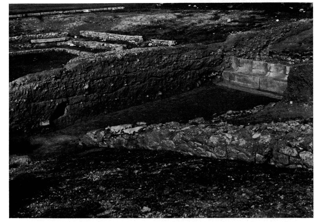 Fouilles de la Société archéologique. — a repris, en 1980, la fouille du théâtre, dont le bâtiment de scène, l'orchestra rectangulaire et la plus grande partie du koilon avaient déjà été mis au jour (v. BCH 101 [1977], p. 531). Les travaux se sont limités, cette année, à l'enlèvement du témoin laissé dans l'orchestra et le koilon (fig. 9) et à l'ouverture de deux sondages au Nord et à l'Est de ce dernier. Outre les observations stratigraphiques qu'elle a permis de faire, la fouille du témoin a produit une dalle d'un siège de la proédrie portant les trois lettres ΤΟΠΡ, le haut d'une stèle votive épigraphe en marbre gris, et un fragment de base moulurée. Aucun des deux sondages effectués dans le koilon n'a permis d'en préciser les limites exactes. Les éléments recueillis cette année confirment que le théâtre fut construit vers le milieu du IVe siècle av. J.-C., utilisé pendant un siècle et demi au moins, et abandonné par suite des inondations saisonnières auxquelles l'exposait son implantation inadéquate. Ergon 1980 (1981), p. 24-25.