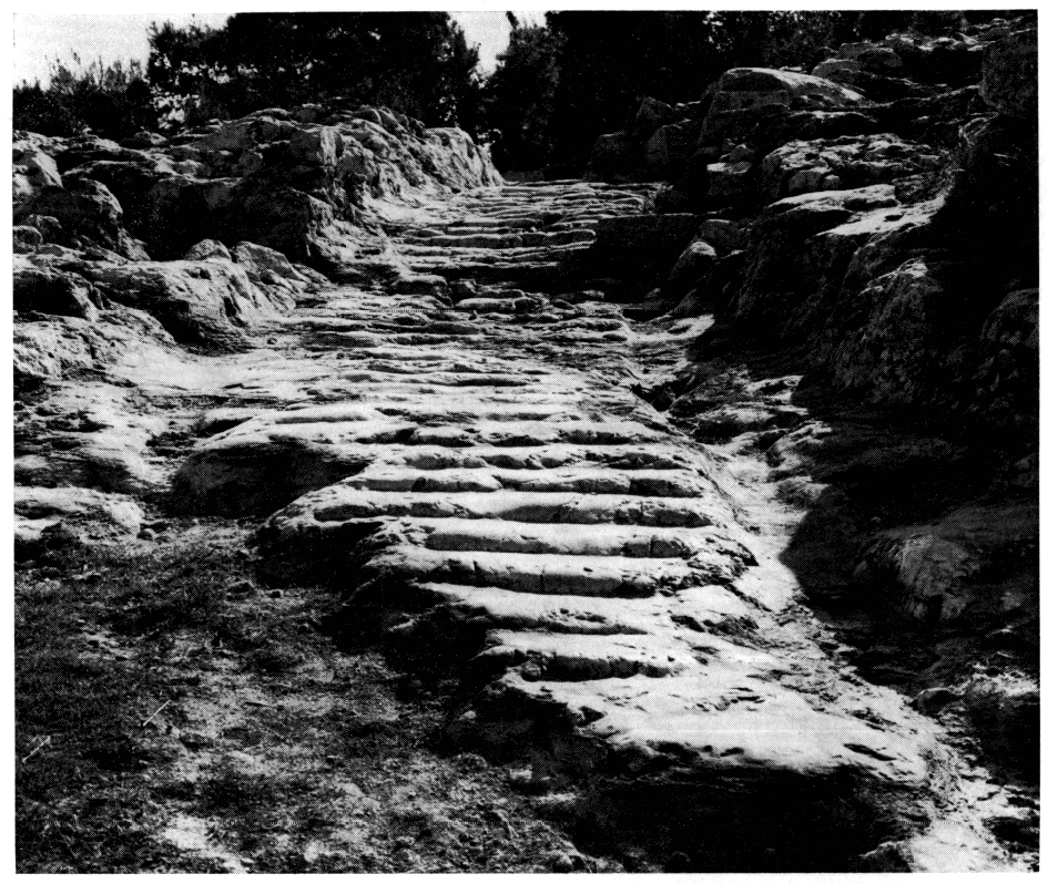 Le tracé de l'enceinte entre les points A et Β n'a pu être établi de façon certaine, malgré des recherches intensives, car le mur — qui fut détruit au IIIe siècle av. J.-C. — n'y était manifestement pas fondé jusqu'au rocher. Le tracé restitué doit cependant correspondre d'assez près à la réalité. Il en est de même pour l'emplacement de la Porte de Mégare, qui a pu être déterminé grâce à la rue descendant de l'acropole dans cette direction. Cette rue, large de 2,20 m et conservée sur 60 m de long, est faite, sur toute sa longueur, de marches taillées dans le rocher, mais les traces de roues visibles sur les deux côtés prouvent qu'elle n'était pas empruntée seulement par les piétons (fig. 12). Ergon 1980 (1981), p. 22-24.