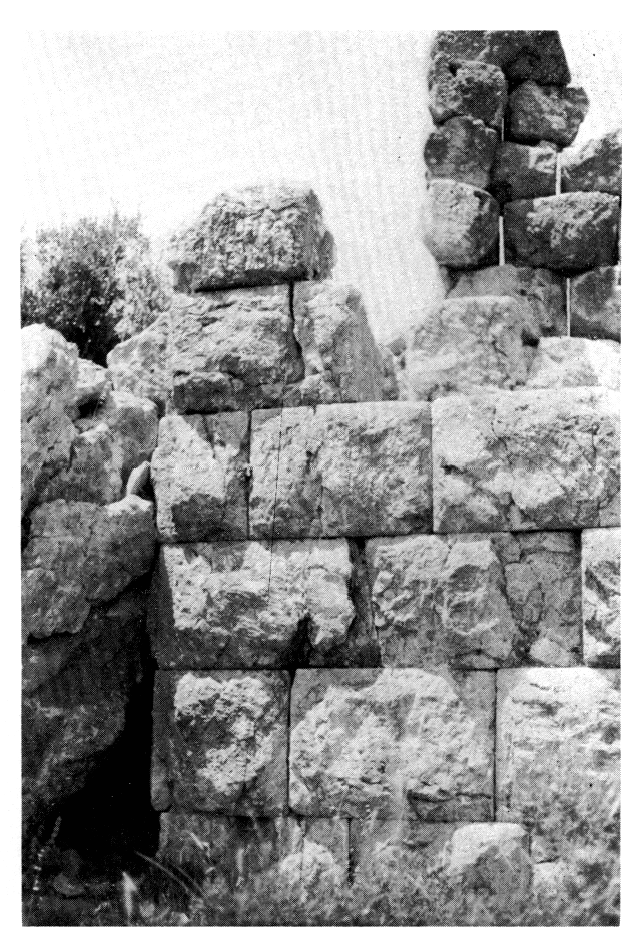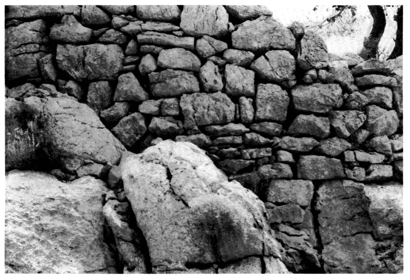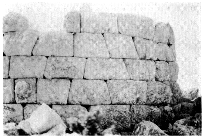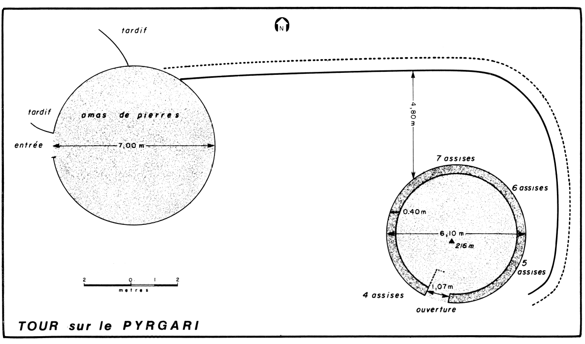 « Pyrgari. — La tour est ronde (diamètre extérieur 6,10 m) et d'appareil régulier et trapézoïdal (L. 0,72 à 0,91 ; H. 0,55 à 0,48 en diminuant vers le haut) à parement rustique (fig. 13 et 16). Elle est marquée sur la carte d'état-major français de 1852.