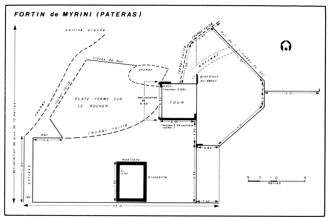 Myrini. — Située à 46 km d'Athènes, via l'autoroute de Corinthe et le défilé du Kandili, la fortification se compose d'un long mur de soutènement de 31 m de long et 1,80 m de haut, qui forme une première terrasse. Sur cette terrasse se trouvent les restes d'une construction rectangulaire à double paroi (7,50 x 4,70 m). Une deuxième terrasse, 3,50 m plus haut, formée de rochers taillés, porte dans sa partie orientale une tour carrée (6,50 m de côté) à double feuillure sur les côtés (fig. 14). L'appareil est régulier avec un parement à bossage travaillé à la pointe. Le mur Nord et Ouest est partiellement préservé sur une hauteur de 3,50 m (6 assises), ainsi que le mur Sud qui s'appuie contre la terrasse rocheuse (fig. 18). Les pierres, en calcaire local, ont une longueur maximale de 1,30 m sur une profondeur de 0,47 m. La hauteur des deux premières assises est respectivement de 0,95 et 0,73 m, mais elle se réduit à 0,60 m à partir de la troisième assise.