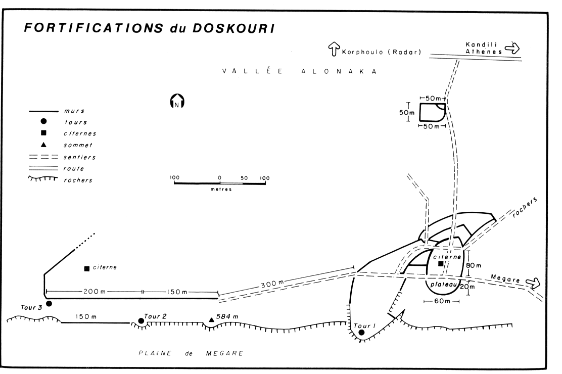 L'ensemble des fortifications domine la plaine de Mégare, à 3,5 km au Nord-Ouest du Pyrgari, et semble être dirigé contre un ennemi venant de la plaine, e.a. : le mur de 150 m qui barre le passage entre les tours 2 et 3. Ici, comme à Myrini et à Pyrgari, on semble avoir affaire à des ouvrages avancés attiques dirigés contre Mégare. »