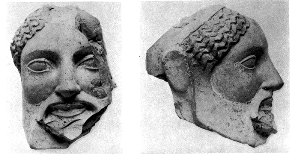 3) Abords Nord de la ligne de départ. — Au Nord et au Nord-Est de la ligne de départ, une épaisse couche de tuiles recouvrait le dernier niveau contemporain de la piste hellénistique. Il s'agit d'une couche de destruction plutôt que d'un remblai, et il est tentant de la mettre en relation directe avec le sac de Corinthe par Mummius. Au-dessus se trouvent les restes de constructions rudimentaires, qui ont parfois réutilisé des matériaux venus d'un peu plus loin et témoignent apparemment d'une réoccupation par des squatters. Parmi les trouvailles de ce niveau on signale deux chapiteaux doriques de la fin de l'archaïsme et une tête en terre cuite provenant peut-être d'un fronton (fig. 22-23).