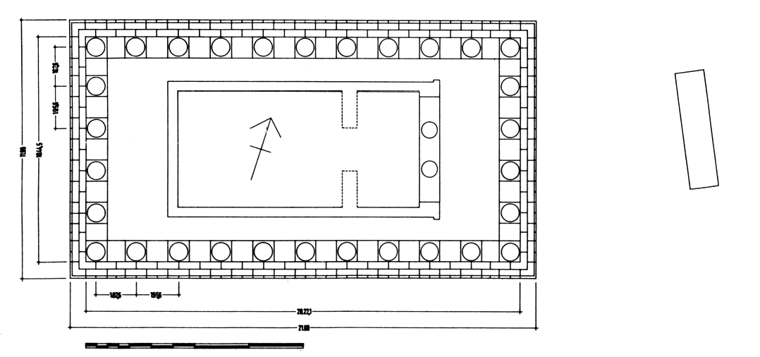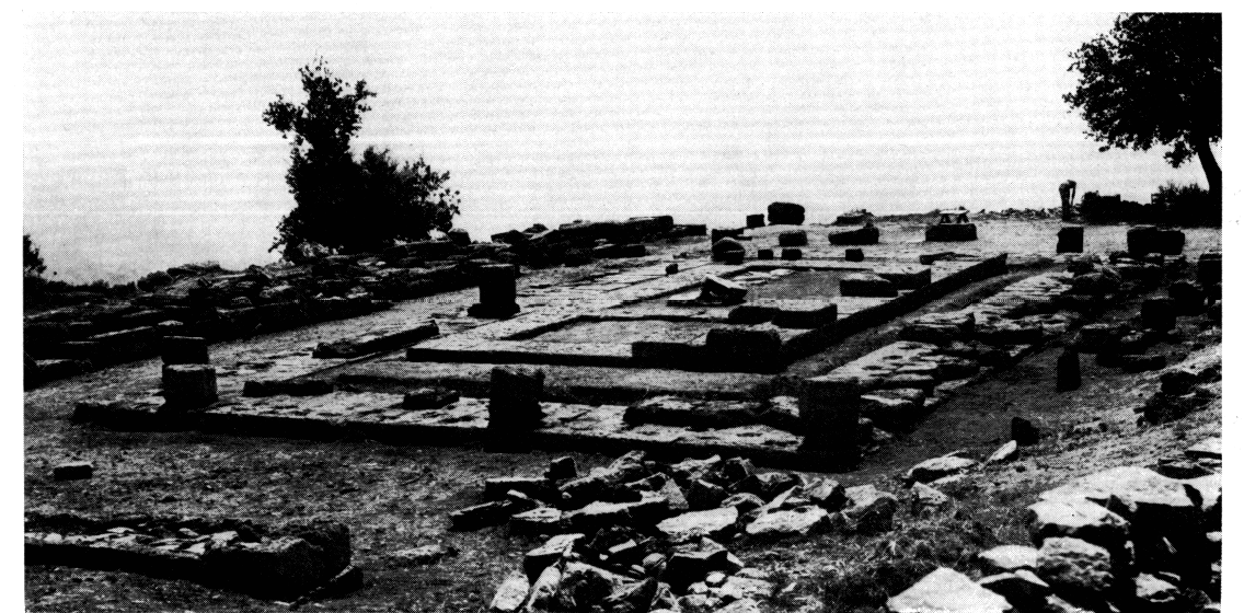 Temple de Démèter. — A la suite d'un nettoyage complet effectué en 1978 (fig. 52), a pu restituer le plan et l'élévation de l'édifice (fig. 53), arasé au niveau de l'euthyntéria et dont on a retrouvé sur place de nombreux blocs : trois fragments de marches de la krèpis, quatre-vingt-dix tambours de colonnes, dix chapiteaux doriques (fig. 54), neuf fragments de blocs d'architrave et quatorze blocs de frise (fig. 55), tous en calcaire coquille. L'euthyntéria mesure 11,90 x 21,69 m et l'on y restitue, sur une krèpis à trois degrés, un stylobate de 10,445 x 20,221 m. La cella était dépourvue d'opisthodome et il n'est pas exclu que ses murs, dont on n'a retrouvé aucun bloc, fussent en matériau plus léger. L'entrecolonnement de la péristasis est évalué à 1,95 ou 1,96 m, ce qui amène à restituer 6 x 11 colonnes. Toutes les mesures permettent de conclure à l'utilisation d'un pied de 0,326 m, ce qui donne un entrecolonnement de 6 pieds, un stylobate de 32 x 62 pieds et une hauteur de 22 pieds jusqu'à la frise. Si l'ordonnance et les porportions du temple suffisent à le dater du IVe siècle av. J.-C., certains détails architecturaux permettent de l'assigner plus précisément au deuxième quart du IVe siècle. ArchAnAth 12 (1979), p. 53-59.