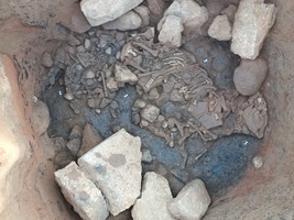 The pithos, measuring 1.74 m in height, with horizontal handles and characteristic corded-pattern relief decoration around the neck and handles, was placed in a pit dug into the soil of the stream's southern bank. Its mouth was sealed by a sturdy semicircular wall built from river pebbles, while two large stones with smaller slab-like ones between them formed false doors toward the vessel's interior, complete with jambs and threshold (Fig. 2). Inside, atop a layer of sand and pebbles, bones from two humans were found, covered by large stones occupying nearly all available space (Fig. 3); grave goods included a bronze tweezers, an ovoid slab stone (table), obsidian arrowheads, and vessels. This isolated burial, despite organized cemeteries of the same period at Tsepi and Marathon's Mati, Agios Kosmas in Hellinikon, and Asteria in Glyfada, provides valuable insights into the diversity of 3rd millennium BC Attica's funerary customs, as well as Cycladic and eastern influences. Approximately 2 m southeast of the pithos, a large circular pit with evidence of long-term use and burning was identified. Its upper section contained a bucranium along with ceramics and historical-period bronze coins, while near the bottom, atop a thick burning layer, a horse skeleton and smaller animal bones were revealed (Fig. 4).