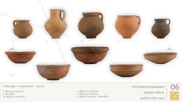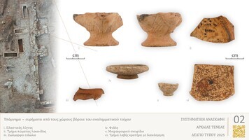 In October 2025, the work of the systematic excavation of ancient Tenea was completed. Around Funerary Monument III (Fig. 1), an extensive complex was uncovered, in use from the Archaic down to the Roman period. The focal point of the complex in the Archaic period is a rectangular subterranean building, around which an extensive paved stone terrace was identified. This terrace is bounded to the north by an ancient road with a retaining wall and a series of functional spaces arranged along it, and to the south by a building with several internal rooms (Fig. 2).