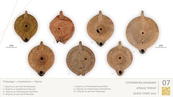 The Archaic subterranean building with its terrace was probably the original space for the performance of the mystery rites, while the retaining wall with the road shows that already in the Archaic period the sacred precinct of worship had been demarcated at the edge of the city’s cemeteries. Probably shortly after the construction of the basin, Funerary Monument III was founded in the 1st century BC, while the earlier structures in the area continued to be maintained and used. The configuration of the area changed radically in the early 3rd century AD, probably as a result of the urban reorganization of the Roman city. The sanctuary area was transformed into an extensive cemetery used until the 5th century AD. In total, twenty-three (23) tombs were excavated, richly furnished with coins, gold and bronze jewellery, glass beads and glass unguentaria, clay vessels, lamps, and other objects (Fig. 4-7). Finally, within the urban fabric of the city, new residential structures of the Roman and Late Roman periods were identified.