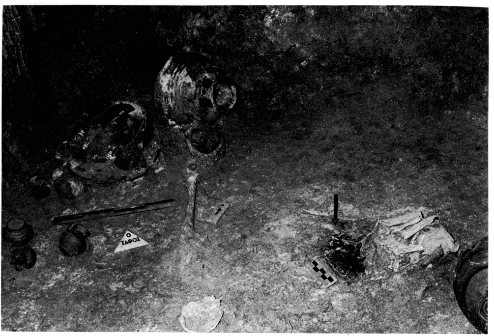 Fouilles de la Société archéologique. — En 1980 a fouillé les tombes Ν, Ξ et Ο de la nécropole mycénienne de Kallithéa. Les caractéristiques architecturales de ces trois tombes à chambre sont les mêmes que celles des tombes précédemment fouillées : dromos court à forte pente et parois convergeant vers le haut, vaste chambre rectangulaire avec plafond à double pente. Aucune d'entre elles n'ayant été pillée, on y a recueilli en tout plus de soixante vases, ainsi qu'une lampe tripode d'un type jusqu'alors inconnu en Achaïe et de nombreux petits objets : éléments de collier, perles, sceaux, deux bagues en bronze à spirales, une pointe de lance en forme de flamme et une grande fibule en bronze en forme de violon. La plupart de ces objets ont été retrouvés dans la tombe O, le dernier étant associé à la seule sépulture à crémation jamais encore fouillée dans la nécropole (fig. 62). Au centre de la même tombe, une petite fosse recouverte de deux dalles contenait des ossements et deux perles de collier. Du point de vue chronologique, le mobilier de ces tombes couvre toute la période HR III. Ergon 1980 (1981), p. 29-30.