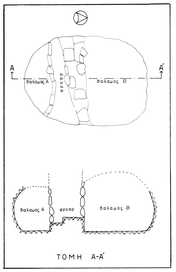 Fouilles de la Société archéologique. — Cinq nouvelles tombes de la nécropole mycénienne de Dendron ont été fouillées, en 1980, par . Il s'agit de deux tombes à chambre et de trois tombes à puits vertical, de facture assez peu soignée et de dimensions modestes. Ce groupe, par ailleurs assez pauvre en mobilier — constitué exclusivement de vases HR III Β — contraste avec celui des grandes tombes à chambre et reflète sans doute une différence de statut social des défunts. Il est à noter que deux des tombes à puits étaient doubles, c'est-à-dire qu'elles comportaient chacune deux alvéoles symétriques, fermés l'un et l'autre par un blocage en pierres sèches, de part et d'autre du puits (fig. 81). Chacun des alvéoles servait à des inhumations indépendantes. On distingue donc désormais quatre types de tombes dans la nécropole de Tanagra : les tombes à chambre de type habituel, les tombes en partie taillées dans le rocher et en partie construites, les tombes à puits et les tombes à fosse. Les deux derniers types sont les plus récents.