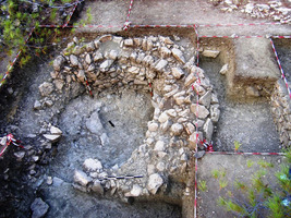 On the plateau southeast of the Mycenaean acropolis (Pyrgiakoni), documentation of architectural and other visible remains inside the Hellenistic temenos continued. Ca. 15m southwest of the Mycenaean tumulus, a well (external diameter 4.9m) was fully excavated to a depth of 2m. It had a narrow descent cut into its east side (Fig. 2). The well, which was dug at the site of a natural basin and spring, probably served the neighbouring sanctuary during the Hellenistic period. It contained a large quantity of Hellenistic plain and black-glazed pottery, and amphora toes, as well as a few sherds of Late Roman and Early Byzantine combed ware which date its final abandonment and filling.