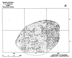 Two artificial openings in the top of the Mycenaean tumulus were shown to be linked by two cut channels which define an altar-like mass of bedrock in the area between the openings (Fig. 4). The openings may have been made to receive liquid offerings.