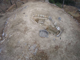 Slightly to the north, excavation continued in the area of the Late Mycenaean low exedra or platform close to the west side of the tumulus. The unexcavated west half of this pebble surface was exposed, revealing it to be an irregularly-shaped oval feature (8.5m maximum diameter, 6m minimum) in use from LH IIIB2 – LH IIIC Early on the basis of the plentiful pottery from its surface (Fig. 3). Located in an open area, it was probably used for ritual activities related to the tumulus. Damage from further illegal excavation was noted, including the collapse of part of the southeast corner of the monumental limestone exedra in the centre of the temenos.