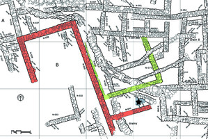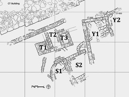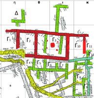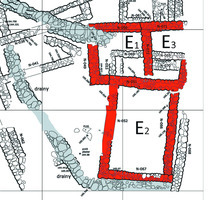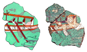 In the south part of the excavation area, a complex of small dwellings was excavated (Fig. 1). The north building has three probable storerooms dating from LH II-LH IIIA1. Fragments of wall painting found in the fill within the rooms include depictions of part of a ship with rowers and dolphins beneath (Fig. 2), parts of female figures, and other subjects. The paintings likely decorated an upper-floor room.