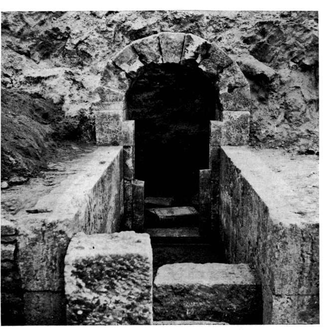 Une nouvelle tombe de type macédonien, datée du milieu du IVe siècle av. J.-C., a été découverte en 1974 à l'occasion de travaux de nivellement. Elle possède un dromos voûté de 5 m de long (fig. 124) et une porte en marbre à deux vantaux de 2,35 m de haut (fig. 125). La chambre elle-même, qui n'a pu être explorée complètement à cause des dangers d'effondrement, n'était vraisemblablement pas construite mais plutôt taillée dans le rocher. Deux pieds sculptés et plusieurs fragments du lit funéraire en marbre (hauteur 1,25 m) ont été retrouvés autour du monument. ArchDelt 29 (1973-74) [1980] Chron., p. 787-788.