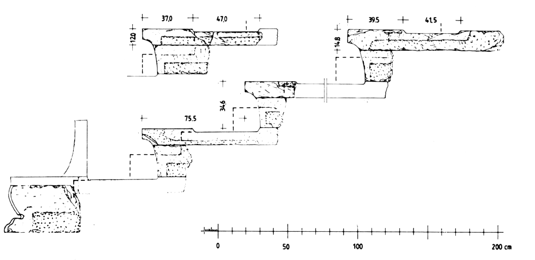 6) Théâtre. — Des éléments de sièges de la proédrie ont été identifiés (fig. 161). Quant aux blocs à face antérieure concave précédemment attribués à un stade (v. BCH 104 [1980], p. 664), un examen plus poussé a montré qu'ils appartenaient aussi au théâtre. Certains d'entre eux présentent une courbure dont le diamètre correspond à celui de la cavea tandis que d'autres sont droits, ce qui indique que les deux kerkides extérieures n'étaient pas incurvées.
