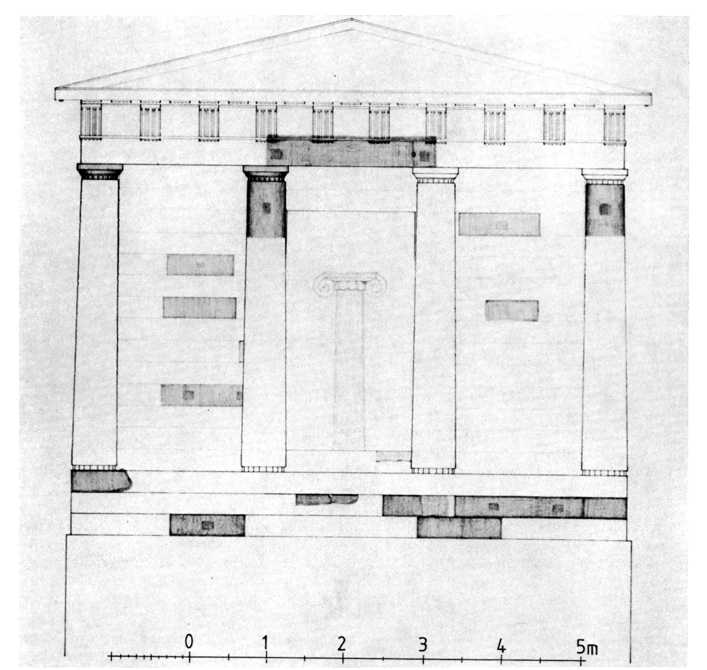 4) Hérôon d'Archiloque. — L'ensemble des quelque soixante-dix blocs remployés dans l'église en ruine de Tris Éklissiès (fig. 160), amène à restituer un édifice dorique prostyle tardo-classique, qu'on ne peut guère interpréter que comme un hérôon (fig. 162). Large de 7,11 m, il s'élevait sur un socle en marbre bleuté surmonté d'une krèpis en marbre blanc à trois degrés en façade. Aux entrecolonnements correspondaient trois triglyphes en façade et quatre aux extrémités des longs côtés. La hauteur des colonnes est évaluée à 7 fois et 3/8 leur diamètre inférieur. Le mur de façade, directement accolé aux antes des longs côtés, fut rajouté après coup. La porte n'avait pas de vantaux et l'on devait voir, de l'extérieur, le monument funéraire d'Archiloque qui se dressait probablement au milieu de la cella : une colonne archaïque surmontée du chapiteau ionique portant l'épitaphe du poète et retrouvé par en 1960 dans la basilique (v. BCH 85 [1961], p. 846 et 847, fig. 24-25). Aucun élément de la frise ni du toit n'a été retrouvé.