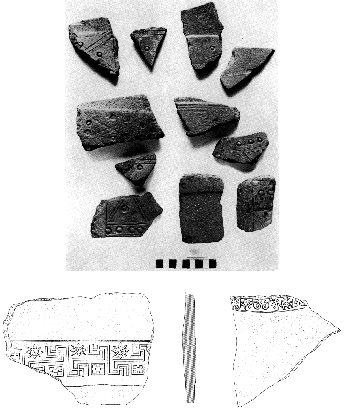 Dans le second secteur (B), à 24 m au Sud de la chapelle, on a mis au jour plusieurs tronçons de murs de facture assez rudimentaire ainsi que des « bûchers » ou foyers avec ossements d'animaux et débris végétaux carbonisés, fragments de vases à vernis noir, de bols mégariens et de pithoi à décor linéaire en relief (fig. 167-169).