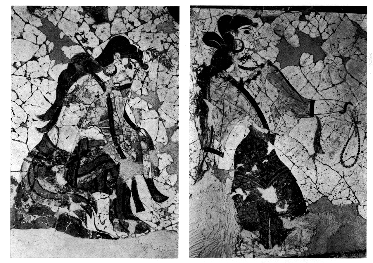La restauration du groupe des fresques dites des Ramasseuses de crocus a été achevée (fig. 172-173). On a pu ainsi démontrer que les deux péplophores formaient avec la troisième — incomplète — une composition qui ornait le mur Nord du bassin de purification, tandis que le mur Est était décoré d'une fresque représentant un sanctuaire couronné de cornes de consécration. La fresque des Ramasseuses de crocus proprement dite se déroulait sur les murs Nord et Est de la pièce située à l'étage supérieur. Il semble en effet que l'endroit d'où elles proviennent fût un édifice cultuel à deux étages. Ergon 1980 (1981), p. 40-41.