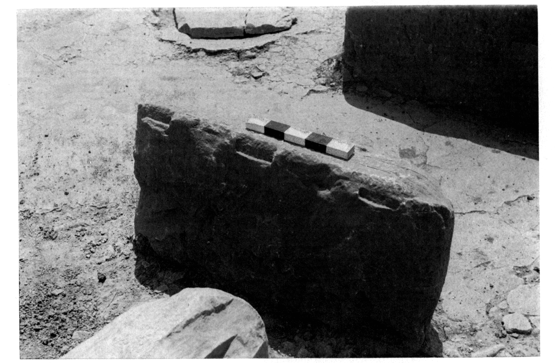 Un nettoyage attentif de la cour Sud a fait apparaître, notamment dans sa partie Nord, des restes d'installation industrielle : base de colonne, fondations en pierre, murets en pisé, plans de travail, fragments de meule, morceaux de minerai et de litharge, etc. Mais l'un des principaux résultats de la campagne a été la découverte, au Nord des pièces I à V, d'une seconde cour, bordée, à l'Est et au Nord, par deux séries de pièces qui forment un angle droit. Celle qui jouxte la pièce VI, à l'Est, était divisée en deux compartiments. Le plus petit, au Sud, abritait un foyer dans lequel était noyée une masse de fer ; le plus grand, au Nord, comportait deux structures plus complexes : dans l'angle Nord-Est une petite aire rectangulaire entourée par un muret en brique crue ; au centre, une vaste plate-forme faite essentiellement en litharge, avec, sur le pourtour, des rigoles peu profondes aboutissant à un bassin ovale aménagé dans l'angle Sud-Est et, encastrées dans ce sol, quatre dalles de calcaire (flg. 6), dressées deux à deux à angle droit et portant des traces de feu. Ce dispositif est vraisemblablement lié à des opérations de fusion ou de raffinement comme la coupellation.