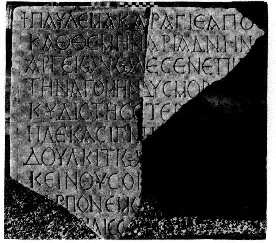 3) une basilique paléochrétienne dont on a dégagé l'abside centrale et une partie du mur oriental. La largeur totale de l'édifice est estimée à 45,50 m. Au pied du mur de l'abside on a recueilli des fragments de stuc peint et découvert une fosse qui contenait neuf grands vases du VIIIe-IXe siècle ap. J.-C. ; à l'Est du mur de la nef Nord, plusieurs fragments de carreaux en pâte de verre noire à décor incisé ; et, dans tout le secteur fouillé, de très nombreux fragments d'architecture (chapiteaux, colonnes, colonnettes, meneaux, plaques de chancel, etc.). Ceux-ci avaient souvent été réutilisés dans des tombes plus tardives, comme c'est également le cas pour la stèle de la fig. 35, qui nous apprend que la basilique était consacrée à Saint Paul. Au Nord de l'édifice on a mis au jour les fondations d'un ou deux bâtiments, que les monnaies et les fragments de lampes (de type nord-africain) permettent de dater du VIe siècle ap. J.-C. ArchDelt 29 (1973-74) [1979] Chron., p. 219., p. 242-246.
