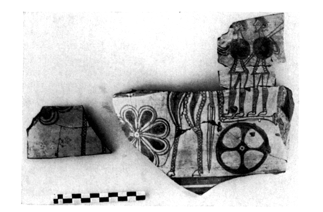 L'étude, par , de la céramique HA recueillie pendant les campagnes de 1977 et 1978, permet d'ores et déjà d'établir la séquence suivante. Les deux premiers états de construction auxquels correspondent de grandes maisons datent du HA II. Outre des fragments de saucières en Urfirnis, ils ont livré une abondante vaisselle domestique brun-rouge ou brun-jaune essentiellement représentée par des petits bols à bord rentrant (fig. 40). Au-dessus, se superposent une couche de destruction avec traces de violent incendie, et un horizon HA III caractérisé par de la céramique protominyenne, des tessons peints à décor pointillé (dotted ware) ou à motifs blancs sur fond noir, et des vases du type ouzo-cup. L'Urfirnis à motifs linéaires sur fond clair n'apparaît pas encore, mais la couche suivante en a livré quelques tessons de la phase primitive. On note, à la différence de Lerne, la persistance de la céramique HA II jusque dans les niveaux HA III.