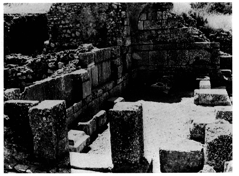 Dans le bâtiment romain, on a nettoyé le porche à piliers, la « cour » et les deux pièces qui la bordent au Nord et au Sud (fig. 53), après quoi l'on a remis en place un certain nombre de blocs écroulés. Ce travail a permis d'apporter des compléments et corrections au plan donné par [IG IV2 1, pl. 3). Il a également amené la découverte de quatre nouvelles pierres inscrites (deux autels, une base d'offrande et un périrrhantérion fragmentaire), de plusieurs fragments de statues, dont celle d'un petit Éros en marbre, et d'une assez riche collection de lampes dont nous illustrons un fragment (fig. 50). Un sondage ouvert sous le sol de la cour a livré du matériel qui remonte au moins à l'époque corinthienne. Ergon 1979 (1980), p. 20-21.