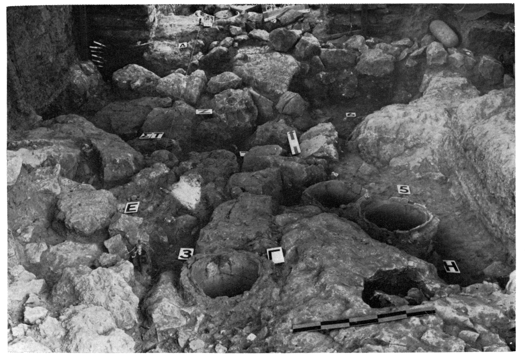 1) Sous le dromos de la tombe, on a dégagé une série de petits pithoi HA encastrés dans des cavités naturelles — parfois deux ou trois pithoi emboîtés l'un dans l'autre — (fig. 58) et qui, à en juger par la quantité de cendres qu'ils contenaient, semblent avoir servi à la cuisson de la nourriture et à la conservation du feu. Tout autour, on a retrouvé un grand nombre de lames et d'éclats d'obsidienne ainsi qu'un nucléus — le premier — qui prouve que le débitage était pratiqué sur place. De l'outillage lithique a également été recueilli sous le stomion de la tombe, associé à de la céramique dont les plus anciens fragments datent de l'extrême fin du Néolithique. La même céramique a été trouvée dans les cavités explorées sous le sol de la tholos. L'une de ces anfractuosités était en outre occupée par deux autres pithoi.