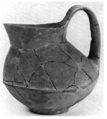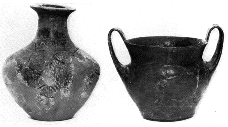 3) Dans le tumulus HM, on a nettoyé les pithoi no 1, 5 et 7 et déposé le pithos n° 11, qui a été recollé au musée. Le premier contenait quelques ossements, les fragments d'un vase minyen noir et une base de saucière HA II. Dans le second on a retrouvé, près du squelette en position contractée, un coutelas en bronze, un canthare minyen noir et une flasque monochrome lissée à décor imprimé et incisé (fig. 60). Le troisième pithos n'a livré qu'un rivet en bronze, provenant probablement du poignard découvert l'an dernier.