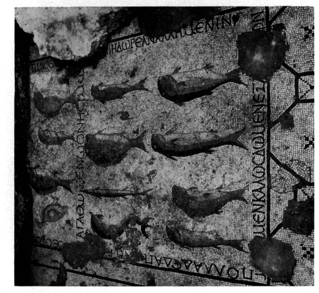 Constructions. — Des maisons d'époque romaine ont été partiellement dégagées en divers points de la ville. Plusieurs d'entre elles possédaient un atrium avec bassin central dallé de marbre, des installations thermales et des pavements de mosaïque. L'une de ces mosaïques représente une scène de chasse encadrée par des motifs géométriques (ibid., p. 355 et 374) ; une autre possède un motif central géométrique et une bordure où alternent bucranes, canthares, boucliers, etc. (ibid., p. 360) ; une troisième (ibid., p. 362-363) est décorée de quatre rangées de poissons et porte une inscription de plusieurs lignes (fig. 74).