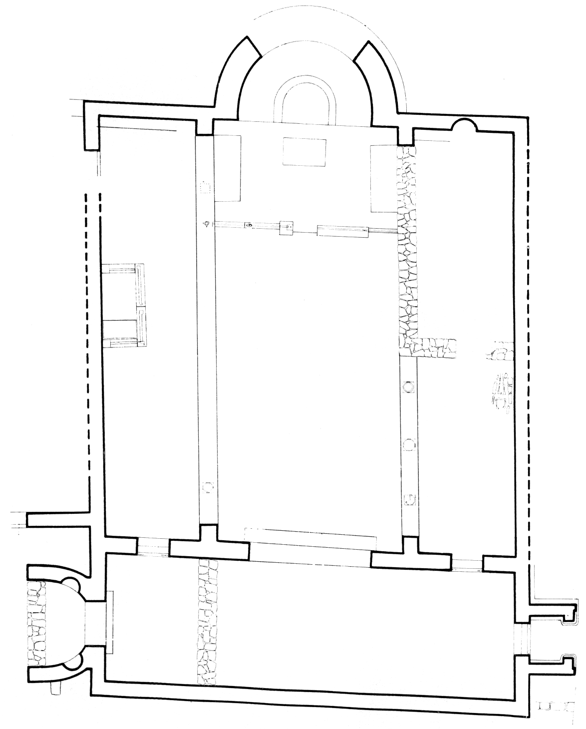 L'abside du sanctuaire était occupée par un synthrônon à deux degrés, devant lequel se dressaient la base de la Sainte Table, à demi ruinée, avec le logement du dépôt de reliques, et, de part et d'autre, le socle des sièges du clergé. Le presbytérium était dallé en carreaux de marbre gris et blancs, à la différence de la nef Sud, dont le sol était fait de fragments de briques et de tuiles noyés dans de l'argile. Les restes d'un mur plus récent, qui isole la partie orientale de la nef Sud, suggèrent qu'après la destruction de la basilique cette partie fut transformée en chapelle. Devant le mur Ouest de celle-ci, on a mis au jour une tombe à ciste sans mobilier.