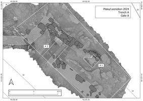 Terrace walls inside the fortification are made of polygonal masonry using the same local limestone as the fortification wall. Terrace wall 6 (TMB06), located between towers C and D, best demonstrates the structural layout (Fig. 3). It runs from northwest to southeast in a distance of 2.5m to the fortification wall and has a length of 12.5m. It is bounded by right-angled corners at both ends and encloses an area of 115m2. A pathway running in front of TMB06 is created by an additional terrace wall in a distance of 3m. Archaeological fieldwork was conducted in the area of the structure formerly named as Tower A (ID 16381, 19639). The excavation in Trench A2 confirmed the assumption that it is not a tower but a gate. No connecting wall between the inner and outer line of the fortification wall could be identified. (Fig. 4). The finds of this trench also support dating the fortification to the fourth century BC.