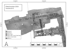 Excavations at the property of K. Zorgias, started in 2023 (ID 19639), were continued in 2024. The full length of 17.5m of the wall of building Q, built of finely cut ashlar blocks, most probably a stoa, was recorded (Fig. 5). The structure was superimposed by a wall of rubble masonry bonded with mortar featuring a U-shaped ground plan, which is likewise dated to the Early Imperial period due to its proximity to the graves found in trench B in 2023 (ID 19639).