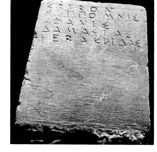 Trois stèles funéraires, remises par des particuliers, ont enrichi la Collection archéologique communale. L'une d'elles (fig. 94) porte cinq noms assez peu répandus : Κρίβον, Ηιππομνις, Άθανις, Δαμασίας, Ηερακλίδας. ArchDelt 29 (1973-74) [1979] Chron., p. 429-430.