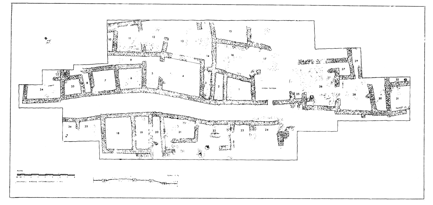 En 1973, après deux premières campagnes (v. BCH 97 [1973], p. 330 ; 98 [1974], p. 643), l'Éphorie des antiquités de Thèbes a étendu la fouille de l'établissement HA à l'Est du « sanctuaire des taureaux » d'une part, et à l'Ouest des pièces 7 et 19 d'autre part (v. plan fig. 93), mettant au jour une dizaine de pièces, plusieurs bothroi et la suite de la rue. A l'issue de cette campagne trente-six pièces ont été fouillées et cinquante-quatre mètres de rue dégagés. En outre, trois tranchées exploratoires ouvertes respectivement à 33 m à l'Est, 10 m à l'Ouest et 50 m au Sud du secteur principal ont toutes livré des vestiges de constructions, ce qui porte à près d'un hectare la superficie du site actuellement reconnue. Le matériel recueilli au cours de cette campagne date exclusivement de l'Helladique Ancien : céramique HA I et II, obsidienne, meules et broyeurs en pierre, fusaïoles en terre cuite, cylindres en os et aiguille en bronze. ArchDelt 29 (1973-74) [1979] Chron., p. 443-444.