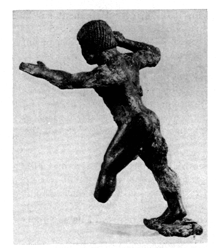 Rue Polyneikous 10 (terrain Sarakostianos). — Dans un premier sondage on a découvert un puits, qui était rempli de céramique du VIe siècle av. J.-C., dont de nombreuses « coupes à oiseaux ». Un petit kouros en bronze (fig. 102) a été trouvé au même niveau, mais dans un contexte céramique mêlé (classique, archaïque, mycénien). Un deuxième sondage a fait apparaître un tronçon de mur, en gros moellons calés par de petites pierres, conservé sur 2,40 m de haut et apparemment associé à de la céramique mycénienne. Quarante aryballes protocorinthiens ont été trouvés dans le même sondage.