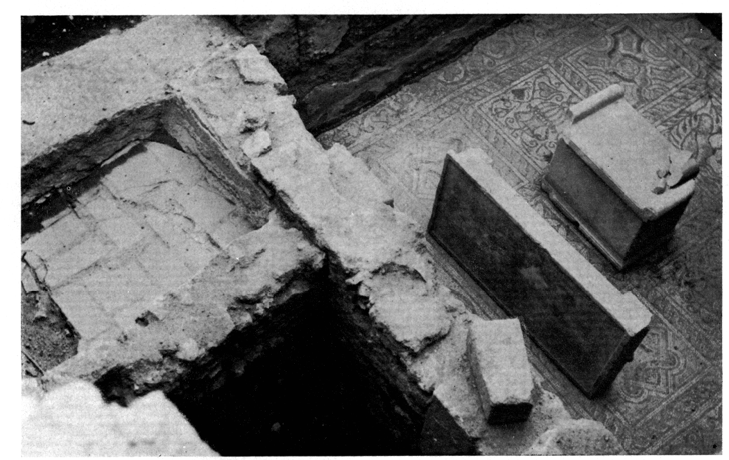 Rue Pindarou 29 (terrain Koropoulis). — La Chronique du BCH 99 (1975), p. 642, a déjà rendu compte des trouvailles du niveau mycénien. Dans les couches supérieures, on avait mis au jour les restes d'un édifice avec mosaïques de sol : deux pièces en enfilade séparées par un stylobate à deux colonnes ioniques, et un espace dans lequel fut aménagé un bassin. Le sol du bassin est revêtu de carreaux en terre cuite, celui des pièces de deux mosaïques différentes à entrelacs ou motifs floraux (fig. 108). Dans l'une des deux pièces se dressaient un autel et une dalle en marbre portant une inscription numérale. Plusieurs phases architecturales ont pu être distinguées : l'un des murs date de l'époque hellénistique, un autre de l'époque romaine, un troisième — contemporain du stylobate, des mosaïques et de quelques remaniements comme le transfert de l'autel à l'endroit où on l'a trouvé — du IVe ou du Ve siècle ap. J.-C. Les mosaïques ont été déposées et transportées au musée, de même que l'autel, la dalle et les fragments d'architecture.