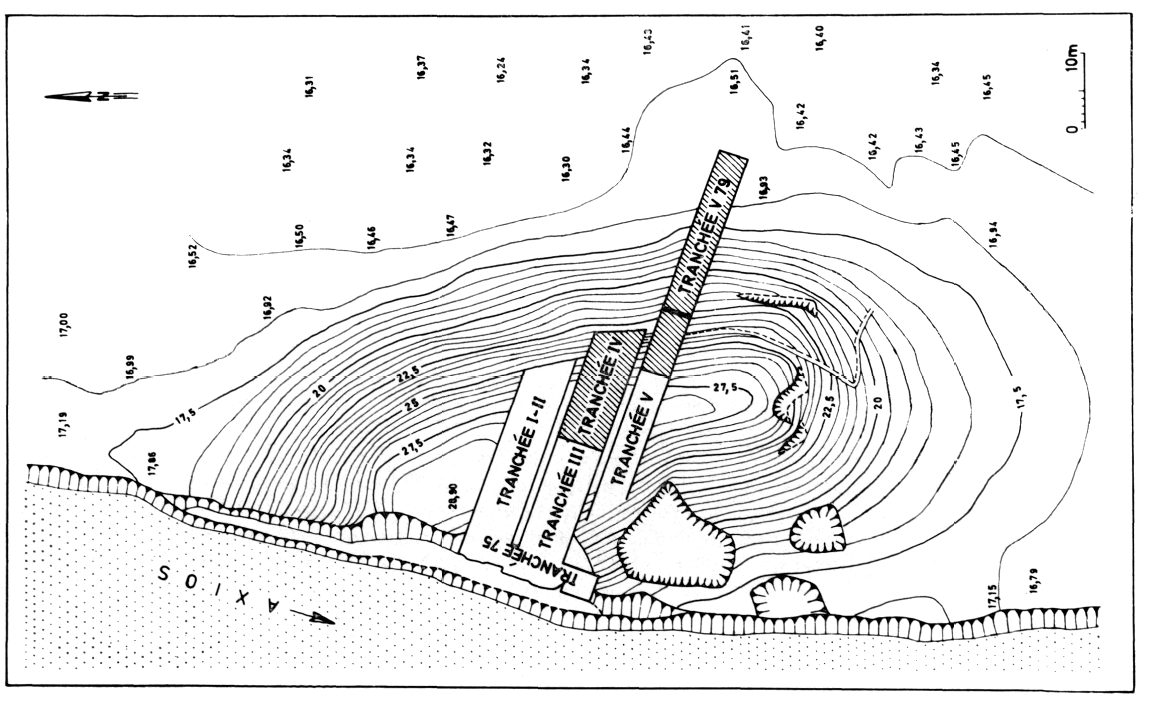 L'exploration de la ligne du rivage ancien, qui se trouve aujourd'hui à 3 m sous la surface du sol, a confirmé et complété l'image donnée par les forages. D'autres forages, effectués sur la toumba même, en ont précisé le relief initial : une éminence tabulaire émergeant à peine au-dessus du fleuve.