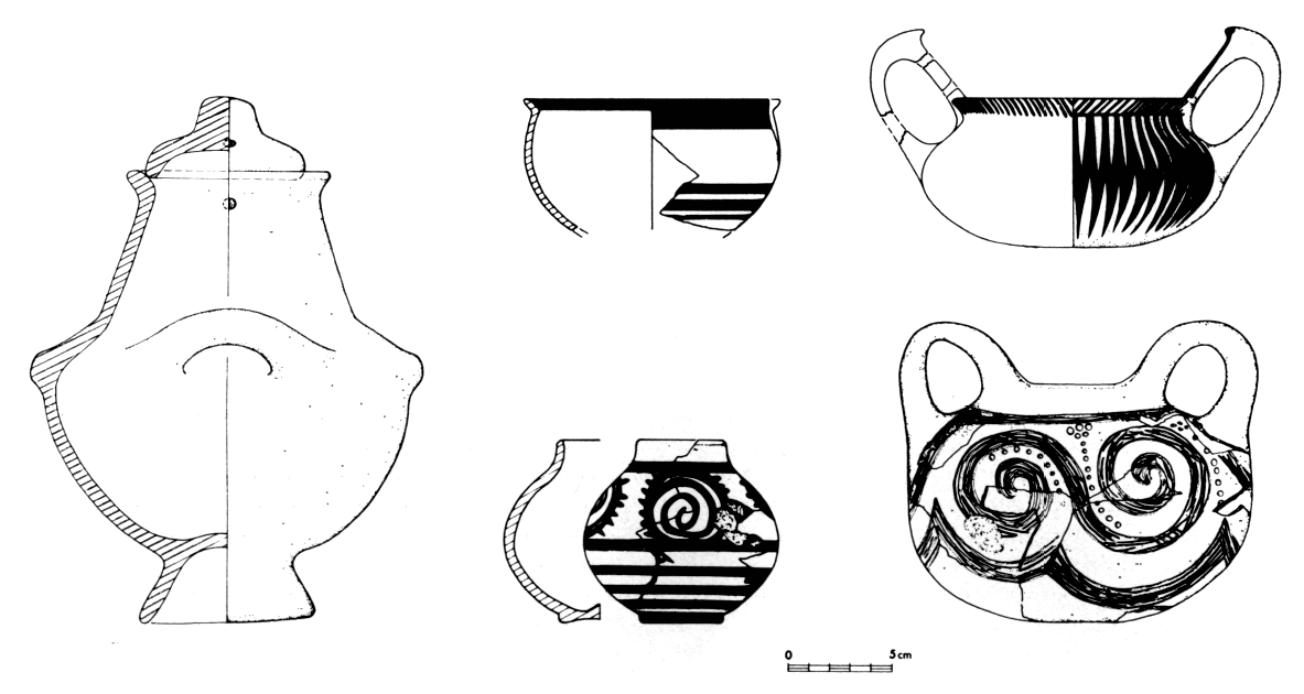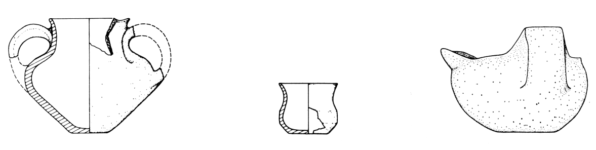 Malgré l'exiguïté de la surface fouillée, les niveaux du Bronze Ancien ont livré un matériel particulièrement riche en formes complètes, dont on peut retracer l'évolution typologique. La fig. 140 illustre un type ancien (au centre) et deux types récents (à droite et à gauche).