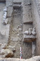 (Université de Bâle), a conduit une nouvelle campagne de terrain sur le site de Bamboula. Lors des deux campagnes précédentes, la fouille avait permis de clarifier une partie du phasage de cette zone de la ville antique (sondage 11), massivement remaniée dans un laps de temps resserré au IVe siècle av. n. è. Cinq phases successives peuvent désormais être reconnues. La plus ancienne date du Chypro-archaïque I ; elle est suivie de trois phases qui témoignent des remaniements profonds effectués avant le IIIe siècle av. notre ère. Le secteur a servi comme zone de mise au rebut de déchets divers, après avoir été utilisé comme zone d’approvisionnement en blocs de taille. S’ensuivent un comblement et un nivellement massifs de cette partie de la ville antique, voisine du port. La fouille de 2025 s’est tout d’abord concentrée sur l’extension du sondage vers le Sud, afin de continuer le dégagement des structures en place découvertes en 2024, directement au-dessous de la zone dépotoir ayant livré des ostraca phéniciens.