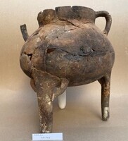 La fouille de 2024 avait permis la mise au jour d’une cuvette fermée vers le Nord par un alignement de dalles de gypse. Le dégagement de la structure permet de comprendre que celle-ci a été progressivement ensevelie par une superposition de couches alternant des compositions argileuses, charbonneuses et cendreuses. On y a trouvé une marmite tripode et une petite cruche Black-on-Red ainsi qu’un galet de forme cubique qui servait peut-être de pilon, les pieds de la marmite avaient été volontairement cassés et déposés contre l’épaule du vase (fig. 3). Le cruchon illustre une forme tardive de l’époque archaïque (BoR III[V]), datable de la fin du VIe ou du Ve s. av. n. è. La marmite représente une forme complètement inédite. La fouille du sol qui les recouvrait (locus 966) a permis d’établir qu’il s’agissait d’un sol en terre battue ayant subi plusieurs nettoyages et réfections. À ce jour, nous avons pu fouiller et identifier trois niveaux de sols successifs. Environ 1 mètre plus au Sud, le sol venait buter contre un muret conservé sur une hauteur de 82 cm. Ce dernier est composé de galets de modules variés correspondant à deux états. Il ne présente aucun parement. En revanche, sur son côté Sud, était appuyée une grande dalle en gypse déposée horizontalement sur le sol, une installation qui rappelle le mode de fermeture de la cuvette fouillée plus au Nord. Le premier état du muret 973 présente, quant à lui, un aspect plus soigné avec l’utilisation de galets de rivière de forme ronde ou rectangulaire. L’élévation correspondant à l’état 2 présente un léger fruit vers le Sud, ce qui semble indiquer que le mur présentait des faiblesses structurelles. Le sol se poursuivait probablement au Sud du muret 973, il est toutefois interrompu par les destructions occasionnées par la tranchée de récupération 976.