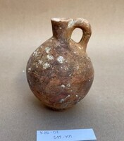 La fouille de 2025 a également permis de préciser le tracé de la seconde fosse de récupération (locus 975), parallèle et contemporaine du locus 976. L’installation de cette fosse a largement perturbé tout le secteur Nord du sondage, qui a livré cette année les premières traces d’une occupation datant du Chypro-Archaïque I (VIIIe-VIIe siècles). Le creusement de la tranchée a également arraché l’élévation en brique crue d’un mur archaïque d’orientation Nord-Sud (locus 978), sans toutefois abîmer ses fondations en pierre. Conservé sur une longueur de 2,03 m, ce dernier a conservé une partie de son élévation. Son parement Ouest était revêtu d’un enduit en plâtre contre lequel trois grands vases de stockage et un petit cruchon avaient été abandonnés. Dans la berme Nord, un mur de retour formait peut-être l’angle d’une pièce. Au total, cinq récipients ont été découverts en place, sur le sol de cet espace (fig. 4-5). Contre le mur Nord se trouvaient une amphore commerciale phénicienne et une cruche Plain White couchées horizontalement sur le sol. Contre le mur Est (locus 978), on a dégagé deux amphores commerciales phéniciennes et une amphore Plain White à anses horizontales, ainsi qu’une cruche-tonneau Bichrome, probablement importée. Les trois grands conteneurs reposaient sur le sol : l’amphore sur sa base annulaire, les deux amphores phéniciennes à l’envers, et dépourvues de leur partie supérieure (coupée au niveau du col). Elles étaient donc déjà en remploi, peut-être utilisées comme boîtes de rangement, lorsqu’elles ont été abandonnées. La fouille de leur contenu n’a toutefois livré que quelques tessons divers, datables de l’époque archaïque. Les éléments dégagés indiquent que nous avons affaire à une pièce (d’habitat ?), abandonnée avec son mobilier en place, scellée par l’effondrement de l’élévation de brique des murs. À l’exception des vases entiers (ou presque entiers), on n’a retrouvé que très peu de matériel. Mentionnons toutefois un peson de terre crue, du même type que le set de pesons recueilli plus au Sud, dans un niveau du sanctuaire également daté du Chypro-Archaïque I, et qui avait été remisé dans un col d’amphore placé à l’envers sur le sol d’une pièce.