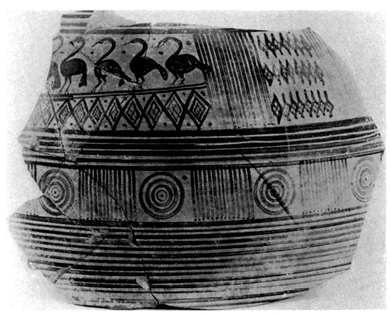 Dans le premier secteur on a mis au jour des murs d'époque romaine qui constituent la suite du portique, lequel s'avère être de type monumental. Dans le second, on a poursuivi l'exploration du péribole géométrique, à l'intérieur duquel sont apparues trois inhumations d'enfants dans des amphores. L'un de ces vases (fig. 157) date du dernier quart du VIIIe siècle av. J.-C. et donne un terminus ante quem pour la construction de l'analemma géométrique sur lequel il avait été déposé. Une autre sépulture, découverte plus au Sud, a livré six tasses monochromes (rouges ou noires) de profil identique, qui datent du Géométrique Récent. Deux d'entre elles portent en rehaut blanc un motif central quadrifolié. Ergon 1979 (1980), p. 4-5.