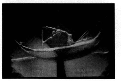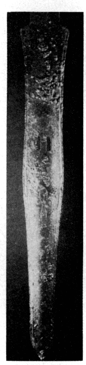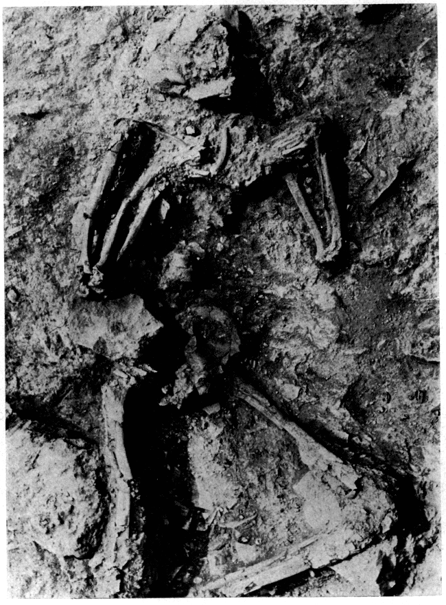 La pièce occidentale, où se déroulaient les sacrifices sanglants, contenait en tout et pour tout trois squelettes. Les deux premiers sont ceux d'un homme et d'une femme qui, comme le personnage retrouvé dans le vestibule, ont été tués, d'après les conclusions de l'expertise anthropologique et médico-légale, par l'écroulement de la toiture. Le troisième appartient à un adolescent, qui était déjà mort lors de la catastrophe finale. La femme, âgée d'environ vingt-huit ans, gisait dans un coin de la pièce, la face contre terre, la main droite sur la tête et les jambes écartées (fig. 190). L'homme, qui avait environ trente-sept ans, était renversé sur le dos, la jambe tendue et les mains à hauteur de la poitrine (fig. 191). Il portait au doigt une bague en argent dont le chaton était plaqué de fer, et au poignet un sceau en agate représentant un bateau monté par un rameur (fig. 186). A côté de lui l'adolescent, allongé sur le côté droit, les jambes légèrement repliées, un poignard en bronze sur la poitrine (fig. 187), reposait non pas sur le sol, mais sur une sorte d'autel rectangulaire. Tout indique qu'il avait été sacrifié par l'homme qui se tenait derrière lui, et que identifie comme un prêtre.