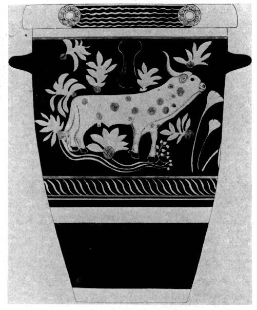 Le vestibule était pourvu de rayonnages en bois, sur lesquels étaient disposés les vases cultuels, dont cent cinquante environ ont été retrouvés sur le sol. Devant la porte de la pièce centrale, une cuvette en pierre était encastrée dans le sol. Au centre du vestibule, dans l'axe de la porte, se trouvait un squelette, auprès duquel on a rassemblé les fragments d'un grand vase cylindrique (κάδος) orné d'un taureau en relief (fig. 188).