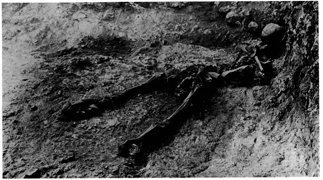 Au fond de la pièce centrale — bourrée de vases et de pithoi — le rocher, qui s'élevait au-dessus du sol, avait été laissé brut dans l'angle Sud-Ouest, et aménagé en banquette le long du mur Sud. Celle-ci supportait deux pieds en terre cuite grandeur nature, que certains détails d'exécution invitent à attribuer à un xoanon.