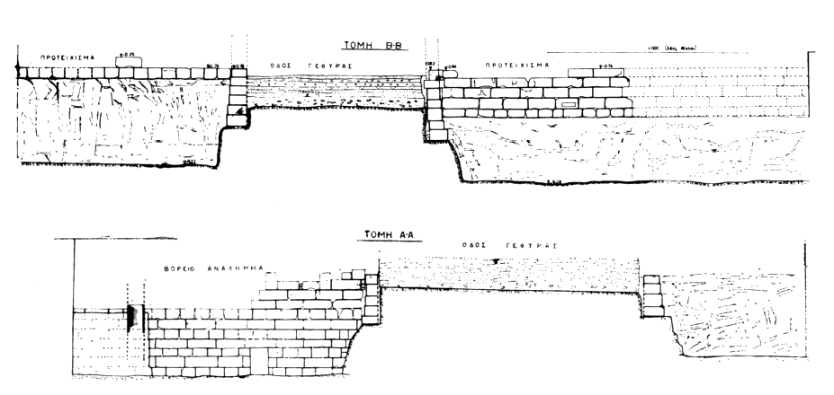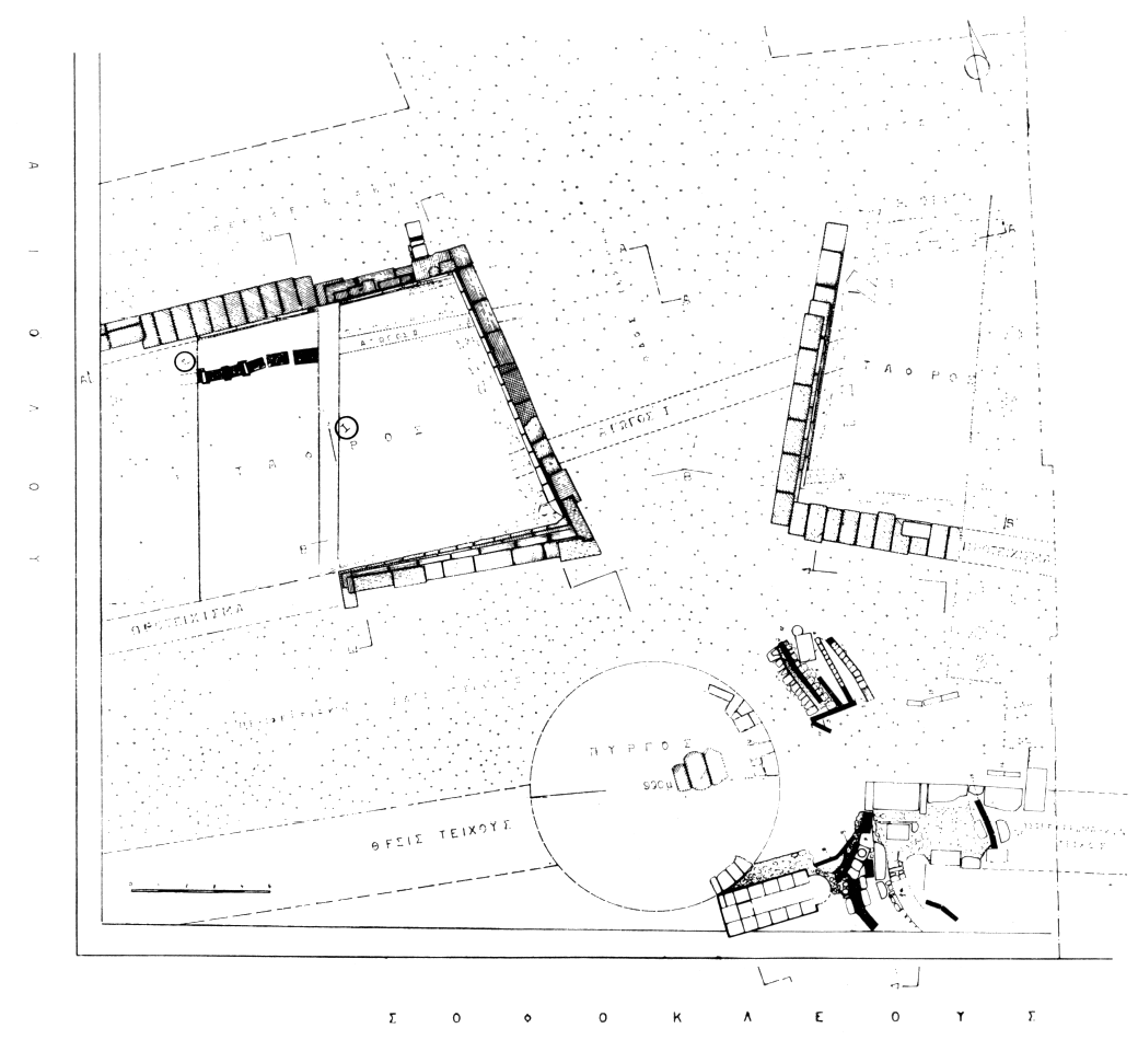 Du rempart du IVe siècle qui, à cet endroit, a complètement disparu (à l'Ouest) ou a été refait à l'époque romaine (à l'Est) il ne reste que les vestiges d'une tour ronde de 9 m de diamètre en appareil isodome (fig. 28-29). L'espace compris entre le rempart et l'avant-mur était occupé par la rue périphérique intérieure, endommagée par des aménagements d'époque romaine tardive. La tour ronde défendait la porte d'Acharnes d'où partait, vers le Nord, une rue perpendiculaire au rempart qui coupait l'avant-mur et enjambait le fossé. Celui-ci a une largeur de 10 m et une profondeur de 6,15 m. Sur toute la largeur du fossé les rives de la rue Nord/Sud étaient soutenues par un mur d'analemma ancré sur le rocher à 3,50 m de profondeur et parfois conservé sur sept assises (fig. 30). Au-dessous passaient des conduites d'évacuation percées dans le rocher. La paroi Nord du fossé était elle aussi renforcée par un mur de soutènement qui se dresse encore, à l'Ouest de la rue, sur onze assises (fig. 31). Au-delà du système défensif on a pu vérifier l'existence d'une rue périphérique extérieure dont la largeur est estimée à 4 ou 5 m. Parmi les trouvailles on signale notamment un grand nombre de vases hellénistiques, de lampes romaines (du Ier s. av. J.-C. au Ier s. ap.), ainsi que plusieurs colonnettes et stèles funéraires inscrites (fig. 25). Ibid., p. 115-120.
